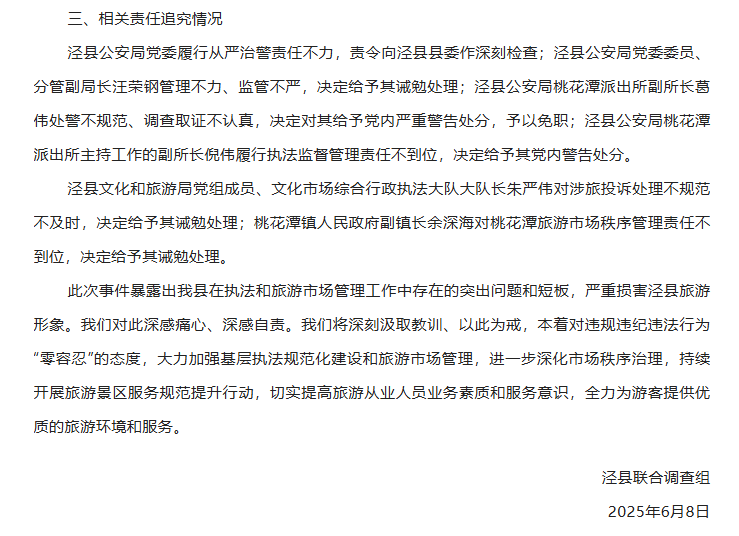 6月7日0時許,涇縣文化和旅游局發(fā)布情況通報稱,已成立工作專班進行全面調(diào)查,向游客蔡某及其家人致歉。但輿論怒火并未完全平息,不少網(wǎng)民表示不能僅讓文旅部門“背鍋”,當(dāng)?shù)毓矙C關(guān)應(yīng)深入調(diào)查、嚴肅問責(zé)。據(jù)微信公眾號“涇縣人民政府發(fā)布”7日晚消息,涇縣召開全縣旅游市場秩序整治工作會議,會議要求“聚焦短板弱項,抓好旅游市場秩序整治”等。