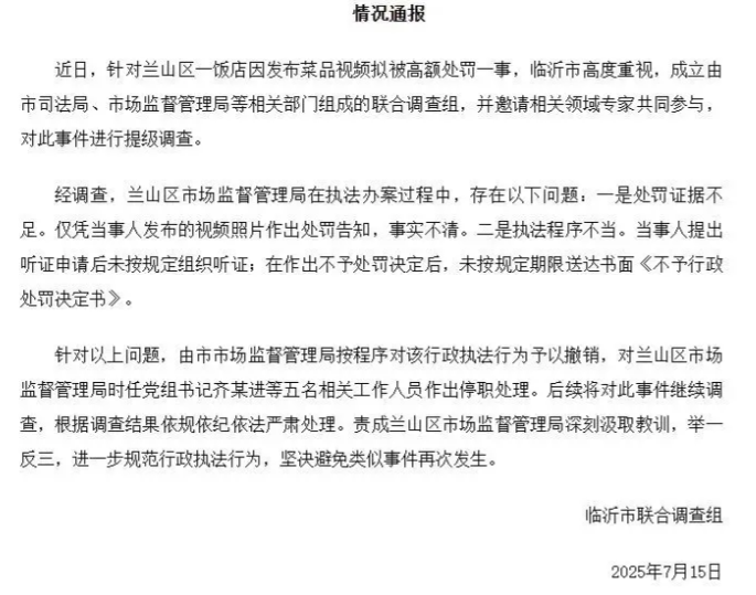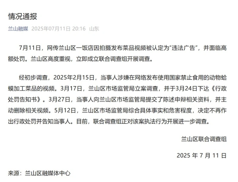臨沂市蘭山區(qū)聯(lián)合調(diào)查組關(guān)于“一飯店因發(fā)布菜品視頻擬被高額處罰”事件的情況通報