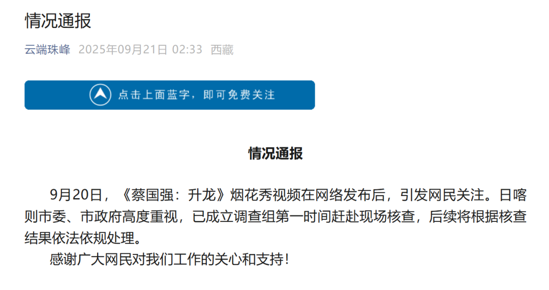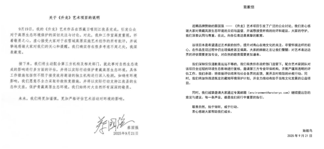 21日凌晨,日喀則市互聯(lián)網(wǎng)信息辦公室發(fā)布情況通報稱,日喀則市委、市政府已成立調(diào)查組第一時間趕赴現(xiàn)場核查,后續(xù)將根據(jù)核查結(jié)果依法依規(guī)處理。當日,蔡國強工作室、始祖鳥分別發(fā)布致歉說明,蔡國強表示將“盡全力采取補救恢復措施”,始祖鳥則稱將邀第三方評估并依結(jié)果補救,同時推進藏地環(huán)保計劃與文化公益項目。