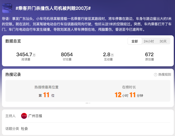 此案被報(bào)道后,環(huán)球網(wǎng)、上觀新聞、《廣州日?qǐng)?bào)》等媒體接力傳播,推高輿情熱度,微博話題“#乘客開(kāi)門(mén)殺撞傷人司機(jī)被判賠200萬(wàn)#”登上熱搜榜第11位。