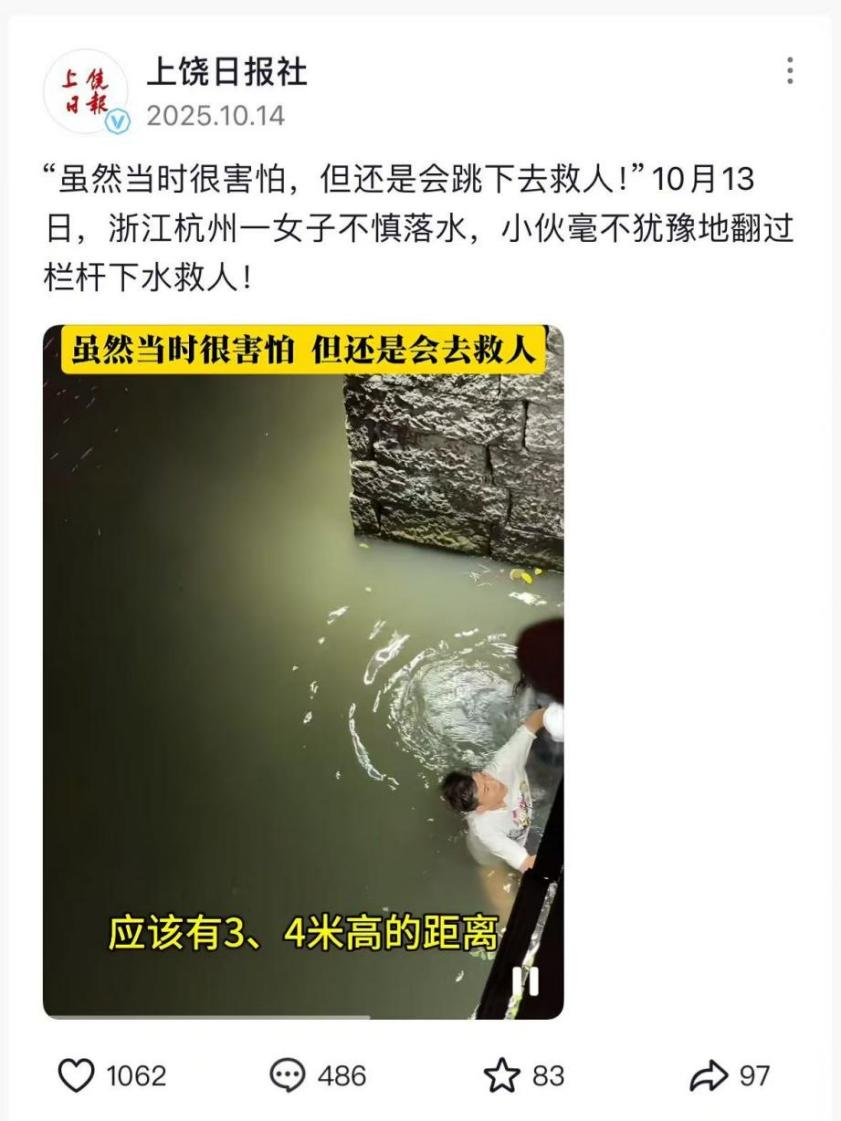 10月14日,“上饒日?qǐng)?bào)社”抖音賬號(hào)報(bào)道稱,10月13日,浙江杭州一女子不慎落水,小伙毫不猶豫地翻過欄桿下水救人,并配發(fā)救人視頻。該視頻引起部分網(wǎng)民關(guān)注,多數(shù)網(wǎng)民為男子救人行為點(diǎn)贊。