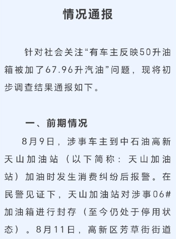 據(jù)澎湃新聞8月20日?qǐng)?bào)道,8月9日,車主楊某駕駛油箱總?cè)萘?0升的小車,在成都市中石油錦華天山站加油,油箱顯示為其加注了67.96升汽油。楊某提出異議后,加油站表示只認(rèn)油槍數(shù)據(jù),堅(jiān)持按67.96升收費(fèi),楊某最終結(jié)賬離開。結(jié)賬離開前,楊某先后向公安機(jī)關(guān)、市監(jiān)局、12345熱線等多部門投訴,并要求加油站封槍。三天后,加油站一負(fù)責(zé)人以私人名義將多收的錢退給楊某,希望其同意油槍解封,但解封后加油站沒有給出過任何解釋。在“問政四川”平臺(tái)上,成都市高新區(qū)管委會(huì)回復(fù)“將在15個(gè)工作日詳細(xì)回復(fù)”;高新區(qū)市場(chǎng)監(jiān)督管理局綜合執(zhí)法部門工作人員表示,有了進(jìn)展辦案人員會(huì)聯(lián)系投訴人。部分自媒體和網(wǎng)民圍繞事件原因進(jìn)行討論,要求官方給出一個(gè)透明、準(zhǔn)確的調(diào)查結(jié)果。深圳廣電集團(tuán)都市頻道“@第一現(xiàn)場(chǎng)”還評(píng)論稱,“監(jiān)管部門不應(yīng)沉默”。