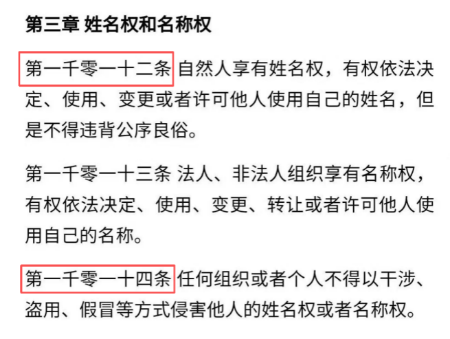 《中華人民共和國民法典》第一千零一十二條、第一千零一十四條規(guī)定,自然人享有姓名權(quán),有權(quán)依法決定、使用、變更或者許可他人使用自己的姓名,但是不得違背公序良俗。任何組織或者個人不得以干涉、盜用、假冒等方式侵害他人的姓名權(quán)或者名稱權(quán)。