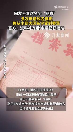 11月5日,據(jù)四川日報微信公眾號報道,四川省廣元市旺蒼縣一位居民通過“四川省網(wǎng)上群眾工作平臺——問政四川”反映,自己不喜歡名字“麗春”,跑了四次派出所,兩次提交申請材料要求改名,但均被旺蒼縣公安局駁回。該網(wǎng)民訴苦說,自己從小到大因這個名字受到不少他人辱罵,造成了精神和心理傷害。
