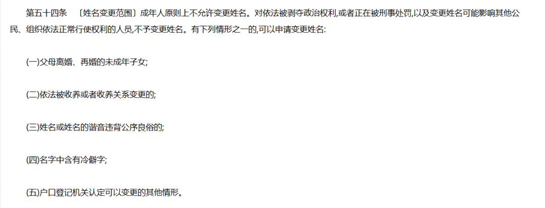 四川省曾經(jīng)出臺了《全省公安機關(guān)戶政管理工作規(guī)程(試行)》。其中,第五十四條規(guī)定,成年人原則上不允許變更姓名。有下列情形之一的,可以申請變更姓名:(一)父母離婚、再婚的未成年子女;(二)依法被收養(yǎng)或者收養(yǎng)關(guān)系變更的;(三)姓名或姓名的諧音違背公序良俗的;(四)名字中含有冷僻字;(五)戶口登記機關(guān)認(rèn)定可以變更的其他情形。