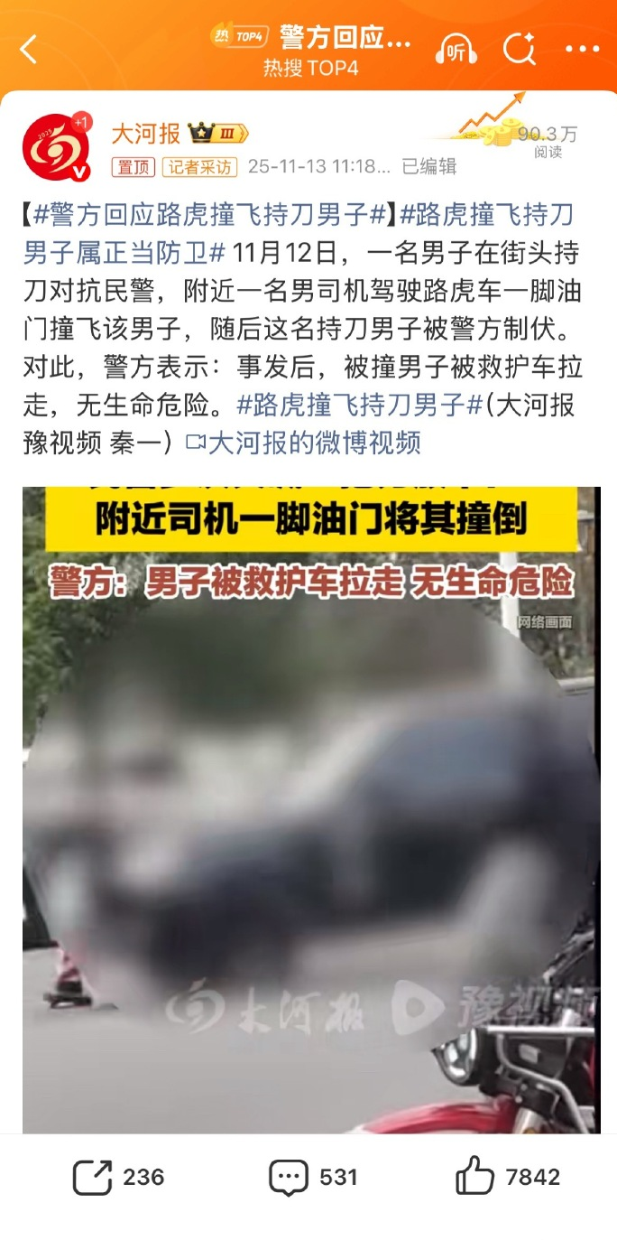 11月12日,多位網(wǎng)民在社交平臺上發(fā)布視頻稱,在河南鄭州某銀行研修中心門前,一男子持刀與民警對峙,并無視警方“把刀放下”的警告,在此緊急情況下,現(xiàn)場一名駕駛黑色路虎越野車的司機(jī)先是倒車調(diào)整位置,隨后突然加速將持刀者撞倒在地,幫助民警將持刀者制服。該視頻一經(jīng)傳播,迅速引起網(wǎng)民熱議,多數(shù)網(wǎng)民稱贊司機(jī)“有勇有謀”,認(rèn)為其果斷撞擊持刀者是見義勇為;部分網(wǎng)民擔(dān)憂非專業(yè)人士直接介入此類高危事件可能引發(fā)不可控的風(fēng)險;另有網(wǎng)民期待官方公布事發(fā)真相。