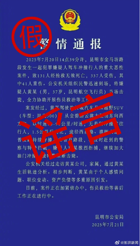 7月20日中午時分,多名網(wǎng)民發(fā)布視頻稱,云南省昆明市金馬碧雞坊附近發(fā)生一起交通肇事逃逸案件。7月21日上午,一份落款為“昆明市公安局”的“警情通報”在網(wǎng)絡流傳,稱“該重大惡性案件致131人死亡,337人受傷,公安機關已將嫌疑人黃某當場擊斃。初步判斷,黃某由于個人感情問題、職位變動、資產(chǎn)負債等多重原因駕車撞人”。通報中傷亡人數(shù)巨大引發(fā)網(wǎng)民震驚和追問,但也有部分網(wǎng)民質疑通報真實性,認為該通報格式、內(nèi)容、邏輯等均有問題。7月21日中午,昆明市交管支隊發(fā)布警情通報稱,該事件系交通肇事逃逸,事故共造成2人死亡,9人受傷。肇事者李某某已被抓獲,已排除酒駕、毒駕嫌疑。7月23日,昆明市公安局五華分局通報稱,白某某、陳某某為博取關注、吸引眼球,傳播虛假“警情通報”,已被刑事拘留。8月1日,公安部網(wǎng)安局微信公眾號將此案作為“凈網(wǎng)——2025”專項行動的典型案例予以發(fā)布。
