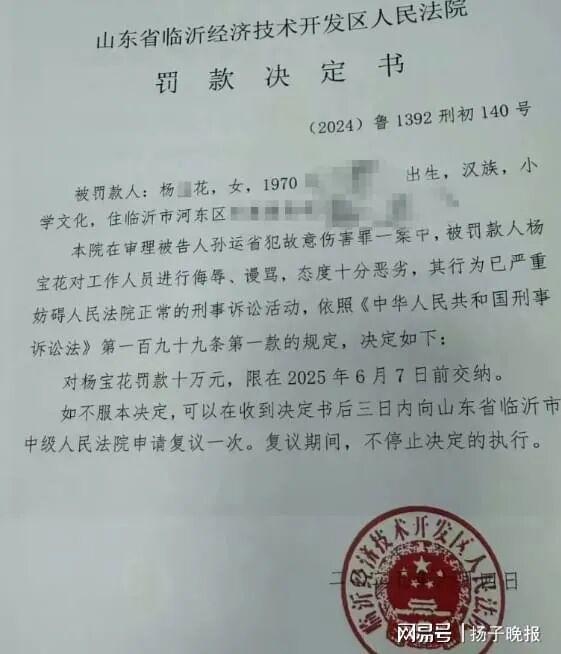 9月15日,網(wǎng)傳“山東臨沂一法院作出十萬元罰款,適用法律錯(cuò)誤”一事引發(fā)關(guān)注。9月16日,媒體報(bào)道涉案詳情,稱臨沂女子楊某花收到其丈夫作為原告的一份判決書,因不滿臨沂市經(jīng)濟(jì)技術(shù)開發(fā)區(qū)法院對被告的判罰過輕,其找到承辦法官于某某理論,其間與法官發(fā)生言語沖突,因此被以違反法庭秩序罰款和拘留。楊某花提出行政復(fù)議,但被告知“已超期”。網(wǎng)民質(zhì)疑法院做出的10萬元處罰違反了法律法規(guī)。9月18日,臨沂市中院副院長和山東省高院新聞發(fā)言人均表示會對此事展開調(diào)查。9月19日,經(jīng)開區(qū)法院官方微信通報(bào)稱,該院已撤銷對楊某花的罰款決定,將10萬元罰款及利息退還并向當(dāng)事人道歉,同時(shí)將追究相關(guān)人員責(zé)任。9月21日,楊某花“辱罵”法官的監(jiān)控視頻在網(wǎng)絡(luò)流傳,視頻顯示,楊某花人身攻擊法官近兩小時(shí),且不聽法警勸阻,做出撕毀判決書等過激行為。部分網(wǎng)民轉(zhuǎn)而為法官“叫屈”,認(rèn)為楊某花應(yīng)受到法律處罰。