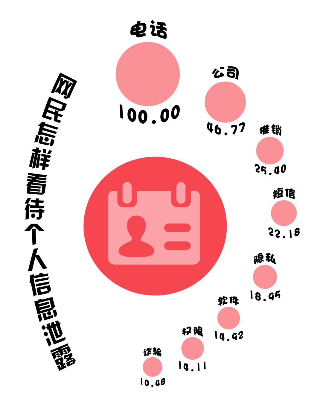 (數(shù)據(jù)來源:選取嗶哩嗶哩視頻《可怕!這7家科技公司盜取身份證信息,4.68億個(gè)人信息泄露》下的931條一級評論,做分詞及歸一化處理,進(jìn)行分詞后將熱度最高的詞語規(guī)定為100)