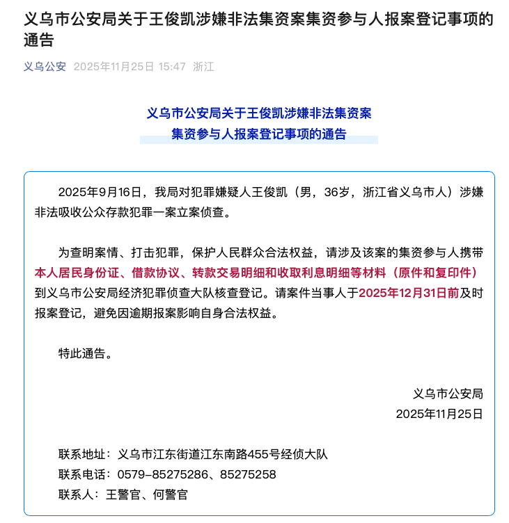 11月25日,義烏市公安局發(fā)布通告:2025年9月16日,我局對犯罪嫌疑人王俊凱(男,36歲,浙江省義烏市人)涉嫌非法吸收公眾存款犯罪一案立案偵查。為查明案情、打擊犯罪,保護(hù)人民群眾合法權(quán)益,請涉及該案的集資參與人攜帶本人居民身份證、借款協(xié)議、轉(zhuǎn)款交易明細(xì)和收取利息明細(xì)等材料(原件和復(fù)印件)到義烏市公安局經(jīng)濟(jì)犯罪偵查大隊(duì)核查登記。請案件當(dāng)事人于2025年12月31日前及時報(bào)案登記,避免因逾期報(bào)案影響自身合法權(quán)益。