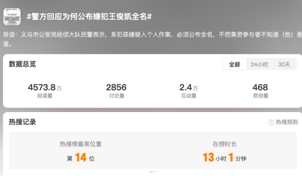 11月26日,義烏市公安局經(jīng)偵大隊(duì)民警接受媒體采訪時回應(yīng)稱,“系犯罪嫌疑人個人作案,必須公布全名,不然集資參與者不知道他是誰”。網(wǎng)民普遍認(rèn)可義烏警方的說法,認(rèn)為警方回應(yīng)質(zhì)疑維護(hù)透明執(zhí)法,批評部分媒體及自媒體“標(biāo)題黨”行為。有媒體分析,從執(zhí)法的角度來看,警方的通告使用“王俊凱”全名于法有據(jù)、于理有因。畢竟,非法集資案件涉及眾多受害人,資金流向復(fù)雜,偵查過程需要最大程度地征集線索、固定證據(jù)。若僅用“王某某”這類模糊指代,確實(shí)會造成集資參與者無法準(zhǔn)確識別、錯失報(bào)案時機(jī),影響偵辦效率。