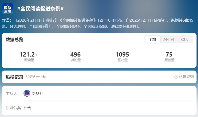 截至12月19日14時(shí),全網(wǎng)相關(guān)信息1.9萬余條。“#全民閱讀促進(jìn)條例#”“#全民閱讀促進(jìn)條例將于明年實(shí)施#”“#中小學(xué)應(yīng)開設(shè)閱讀課程與輔導(dǎo)#”“#鼓勵(lì)車站等公共場所設(shè)閱讀設(shè)施#” 等微博話題閱讀量累計(jì)超2854.3萬。