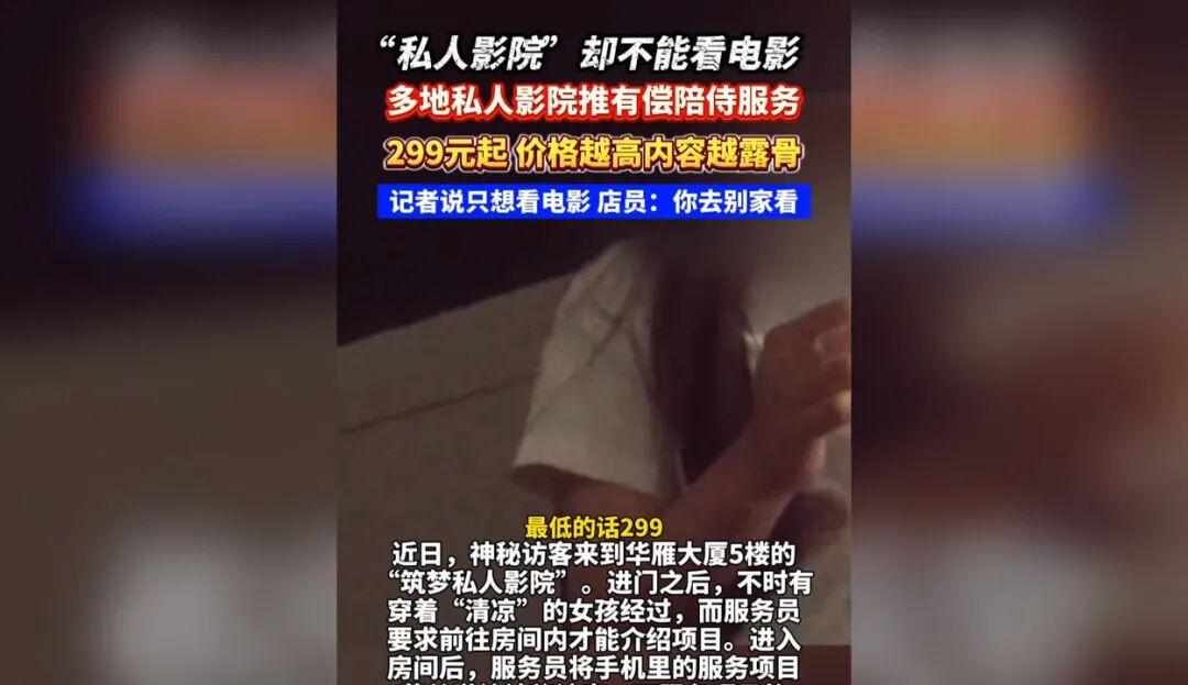 12月19日,江蘇廣電總臺荔枝新聞中心《神秘訪客》發(fā)布暗訪報(bào)道,揭露西安、成都、三亞等多地私人影院出現(xiàn)有償陪侍等違規(guī)服務(wù)。其中,西安“筑夢私人影院”強(qiáng)制顧客選購陪侍套餐,相關(guān)項(xiàng)目名稱露骨;成都“云水謠私人影院”地址虛假,隱蔽提供有償陪侍及“擦邊”游戲服務(wù);三亞貝貝私影俱樂部的簡介中,詳細(xì)列明了各種服務(wù)以及對應(yīng)的報(bào)價,價格越高,內(nèi)容越露骨。