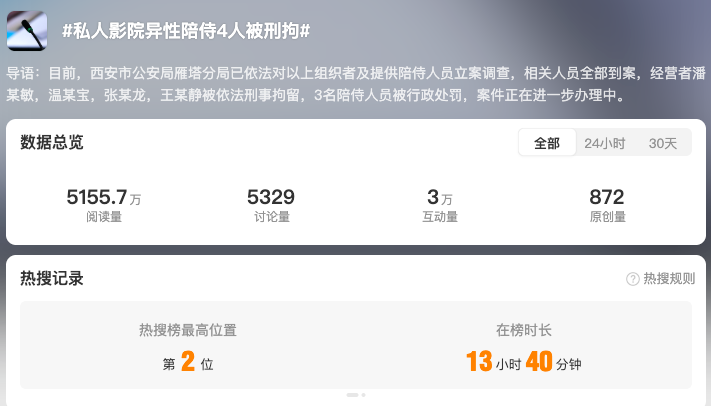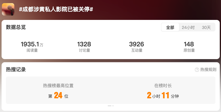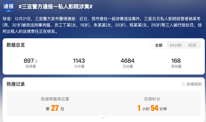 截至12月24日17時,全網(wǎng)相關(guān)信息2.7萬余條。“#私人影院強(qiáng)制要求顧客選擇異性陪侍套餐#”“#私人影院異性陪侍4人被刑拘#”“#成都涉黃私人影院已被關(guān)停#”“#涉黃私人影院3名00后女員工被罰#” 等微博話題閱讀量累計(jì)超1.6億。