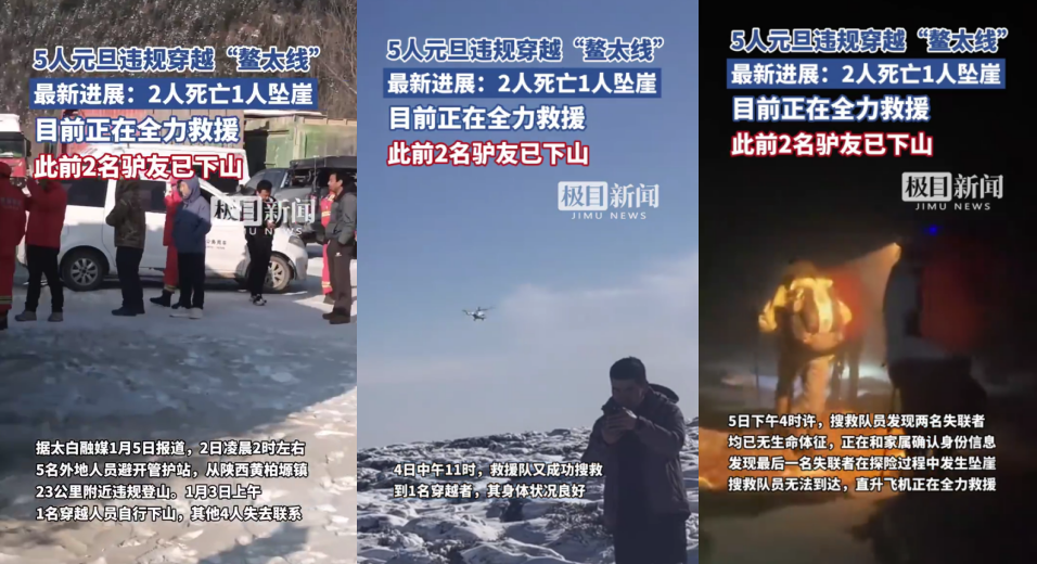 1月3日,有網(wǎng)民發(fā)帖稱“元旦期間5人穿越‘小鰲太線’,4人失聯(lián)”,引發(fā)關注。1月5日晚,“太白融媒”微信公眾號發(fā)布通報稱,1月2日凌晨2時左右,5名外地人員避開管護站,從黃柏塬鎮(zhèn)23公里附近違規(guī)登山。1月3日上午,1名穿越人員自行下山,其他4人失去聯(lián)系。當?shù)仉S后組織救援人員進山全力搜救。1月4日11時,救援隊成功搜救到1人,其身體狀況良好。1月5日下午4時許,救援隊又發(fā)現(xiàn)2名失聯(lián)者,已無生命體征,同時發(fā)現(xiàn)最后1名失聯(lián)者在探險過程中發(fā)生墜崖事故,現(xiàn)場坡陡崖高,搜救隊員無法到達,出動了直升機全力救援。