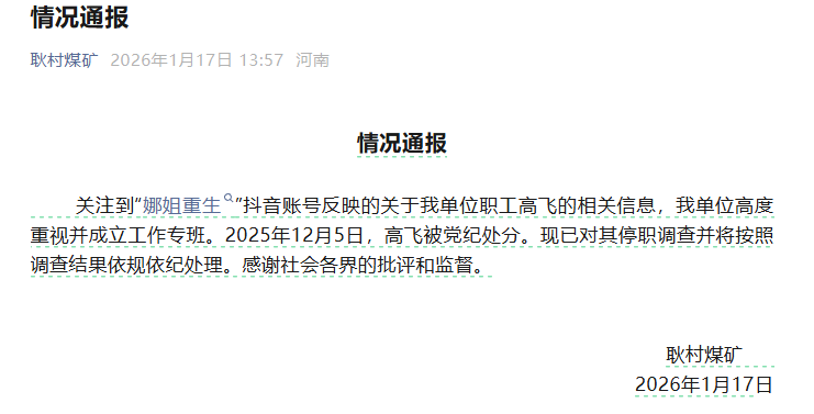 1月17日,男方單位通過“耿村煤礦”微信公眾號發(fā)布情況通報稱,關注到相關信息,單位高度重視并成立工作專班。2025年12月5日,高某被黨紀處分。現(xiàn)已對其停職調(diào)查并將按照調(diào)查結果依規(guī)依紀處理。另據(jù)“@二三里資訊”報道,高某被停工,韓某已從原部門調(diào)至洗煤廠工作。