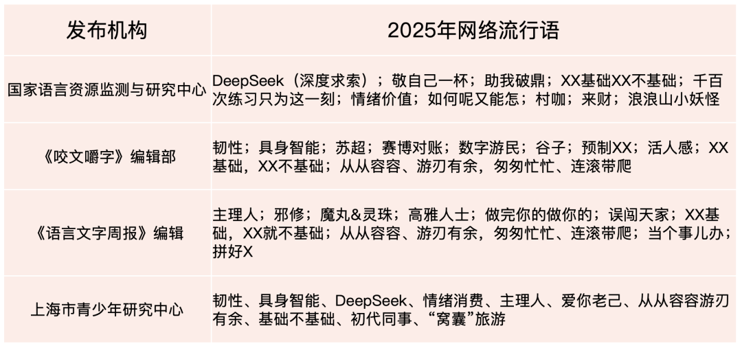 2025年12月,國家語言資源監(jiān)測與研究中心、《咬文嚼字》編輯部及《語言文字周報》編輯部相繼發(fā)布年度網絡流行語榜單。12月25日,上海市青少年研究中心立足青年群體視角,推出了“2025年度青年十大熱詞”。這些入選的流行語涵蓋科技、文化、消費等多個領域,其中“韌性”“DeepSeek”“具身智能”“從從容容游刃有余”等詞匯更是出現在不同機構的榜單上,呈現出高度重合性。它們不僅構成了一部由全民共同書寫的“情緒備忘錄”,也折射出當前傳播格局的演變與社會價值觀念的變遷。法治網輿情中心從使用主體、社會心態(tài)、傳播邏輯、行為趨向四個維度,對2025年網絡流行語展開深入解讀。
