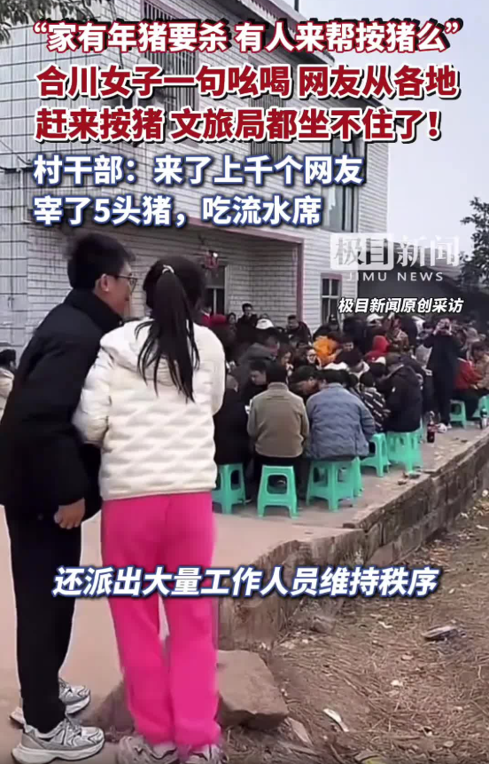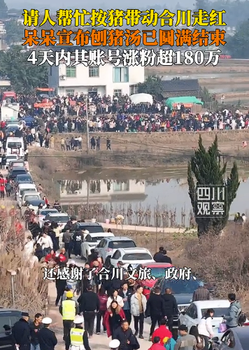 1月9日凌晨,來(lái)自重慶合川的抖音博主“呆呆”發(fā)視頻稱,1月11日家中要?dú)深^豬,因?yàn)楦改改挲g大了按不住,希望有人幫忙按豬,將請(qǐng)吃刨豬湯答謝,“呆呆”還開(kāi)玩笑稱“就想家門(mén)口停滿車,在村里揚(yáng)眉吐氣一回”。短短兩日,視頻點(diǎn)贊量突破18萬(wàn),轉(zhuǎn)發(fā)量超14萬(wàn),“呆呆”建立的6個(gè)500人的“刨豬湯”群很快滿員。盡管“呆呆”連夜采購(gòu)食材并報(bào)備派出所,但已無(wú)法阻止網(wǎng)民熱情。1月10日凌晨,合川文旅緊急抽調(diào)工作人員趕赴現(xiàn)場(chǎng),協(xié)助保障活動(dòng)順利進(jìn)行。1月11日,來(lái)自全國(guó)各地超4000名網(wǎng)民匯聚“呆呆”家鄉(xiāng),其中不乏“鹵鵝哥”等知名網(wǎng)紅。1月11日至12日,“呆呆”連開(kāi)多場(chǎng)直播,邀請(qǐng)網(wǎng)民參加家鄉(xiāng)大聯(lián)歡,直播間觀看和點(diǎn)贊人數(shù)均超3000萬(wàn)人次。在合川文旅、愛(ài)心企業(yè)、網(wǎng)民等多方贊助下,原計(jì)劃的兩頭豬增至五頭,現(xiàn)場(chǎng)設(shè)五個(gè)分會(huì)場(chǎng)分散人流,公安部門(mén)疏導(dǎo)交通。合川文旅部門(mén)帶著本地特產(chǎn)、景區(qū)門(mén)票到現(xiàn)場(chǎng),講解“刨豬宴”和合川歷史文化,還設(shè)置篝火、煙花、舞龍等環(huán)節(jié)。據(jù)現(xiàn)場(chǎng)網(wǎng)民透露,當(dāng)?shù)匾还矓[了300桌宴席,最多時(shí)同時(shí)有超3000人。該事件引發(fā)熱烈討論,“殺豬女孩呆呆一天漲粉150萬(wàn)”“呆呆殺豬宴一天蒸1000多斤大米”等多個(gè)話題沖上社交平臺(tái)熱搜。