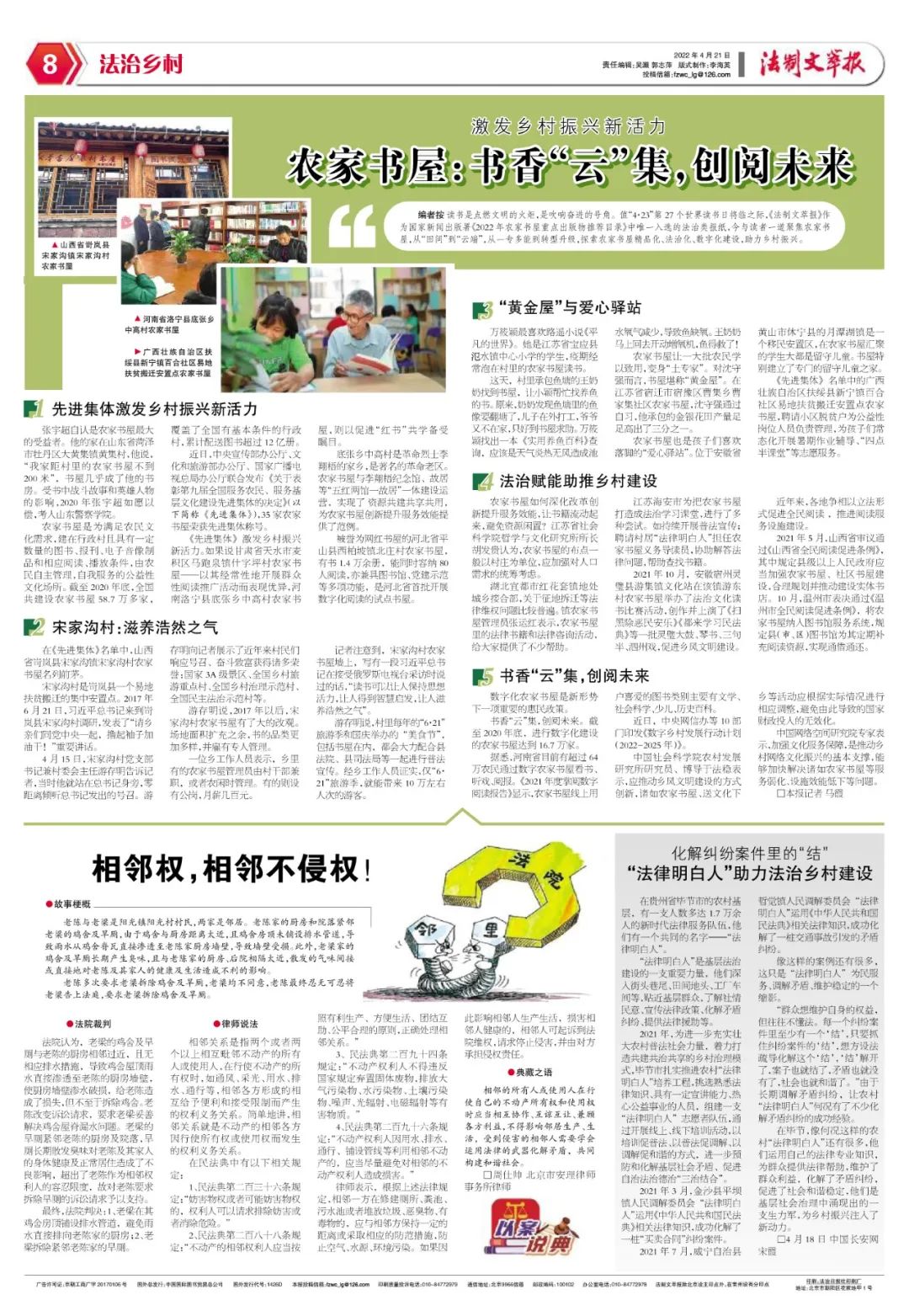 讀書是點(diǎn)燃文明的火炬,是吹響奮進(jìn)的號(hào)角。值“4·23”第27個(gè)世界讀書日將臨之際,《法制文萃報(bào)》作為國(guó)家新聞出版署《2022年農(nóng)家書屋重點(diǎn)出版物推薦目錄》中唯一入選的法治類報(bào)紙,今與讀者一道聚焦農(nóng)家書屋,從“田間”到“云端”,從一專多能到轉(zhuǎn)型升級(jí),探索農(nóng)家書屋精品化、法治化、數(shù)字化建設(shè),助力鄉(xiāng)村振興。