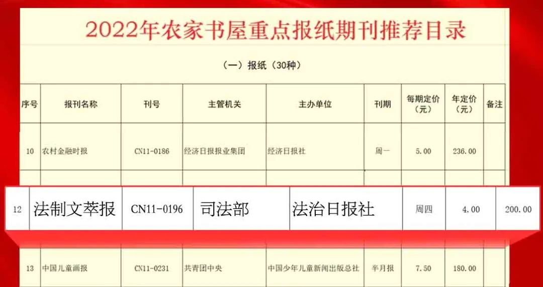 法治鄉(xiāng)村建設是全面依法治國的重要組成部分,是推進農(nóng)村基層治理體系和治理能力現(xiàn)代化的必然要求,是實現(xiàn)鄉(xiāng)村振興的基礎與保障。為深入推進鄉(xiāng)村振興和法治鄉(xiāng)村建設,充分運用好農(nóng)家書屋這一重要陣地,成功入選《2022年農(nóng)家書屋重點出版物推薦目錄》、成為該目錄中唯一法治類報紙的《法制文萃報》即將舉辦“加強法治鄉(xiāng)村建設,助推鄉(xiāng)村振興發(fā)展”系列作品征集活動。此次活動,由法治日報社指導,中央重點新聞網(wǎng)站法治網(wǎng)提供平臺支持。