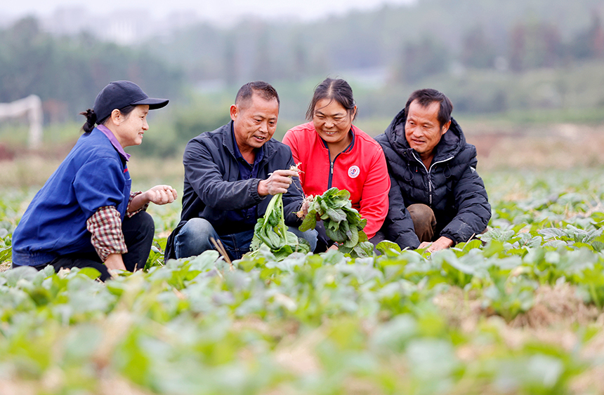 致富帶頭人何力(左二)在向村民傳授蔬菜種植技術。