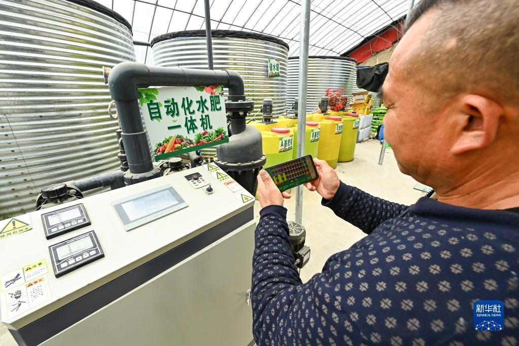 現(xiàn)代設(shè)施農(nóng)業(yè)示范基地的管理人員通過(guò)手機(jī)控制自動(dòng)化水肥一體機(jī)。記者 丁磊 攝