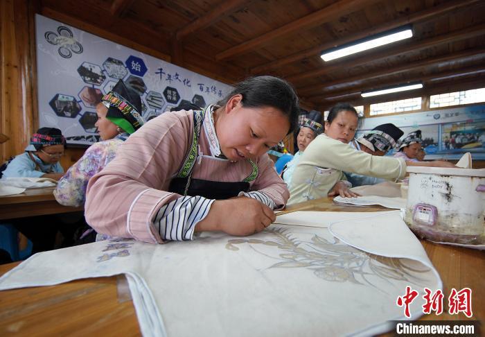 4月17日,在貴州丹寨縣龍泉鎮(zhèn)卡拉村蠟染工坊,苗族婦女在繪制蠟畫。黃曉海 攝