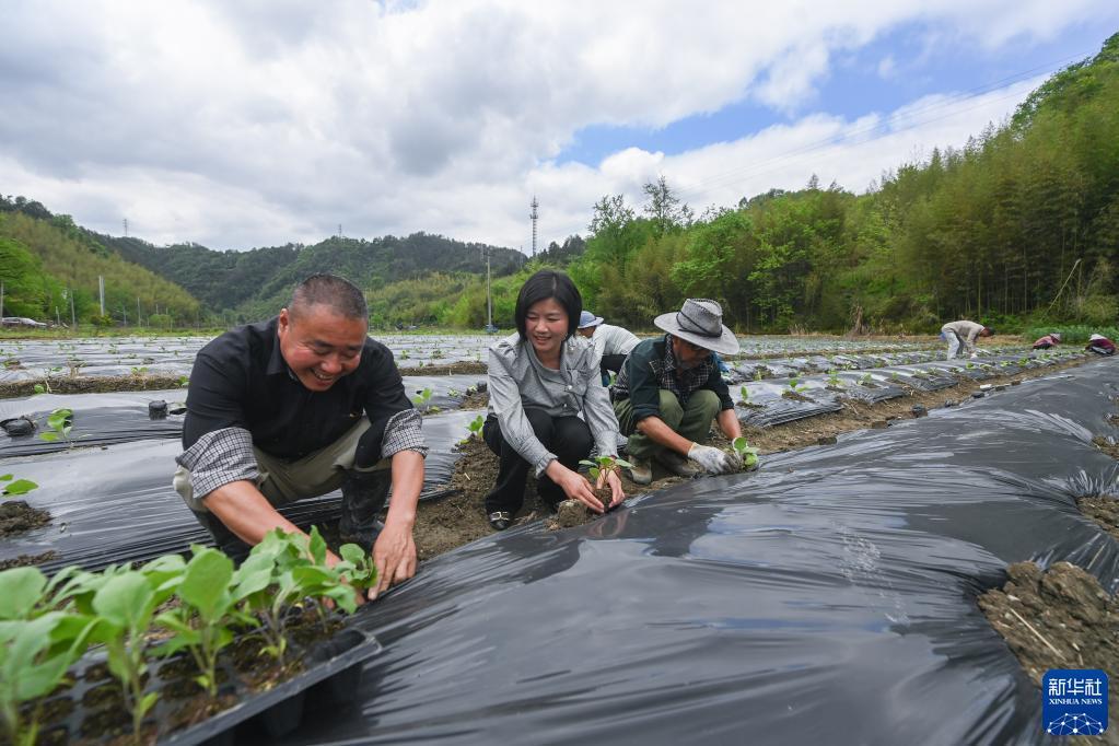 4月20日,返鄉(xiāng)創(chuàng)業(yè)人才俞冬紅(中)在位于臨安區(qū)昌化鎮(zhèn)后營村的蔬菜基地與農戶交流。記者 徐昱 攝