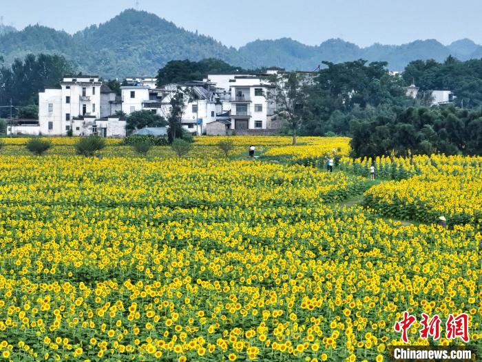 8月9日,游客在黃山市屯溪區(qū)屯光鎮(zhèn)漢沙村欣賞盛開的向日葵花。(無人機照片)施亞磊 攝