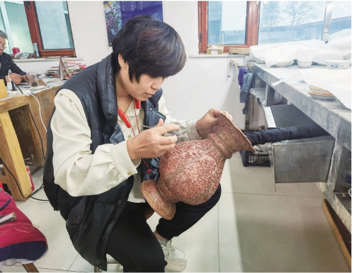 近日,饒陽縣億澤景泰藍(lán)工藝品廠內(nèi),脫貧群眾正在為景泰藍(lán)填充色釉(資料圖)