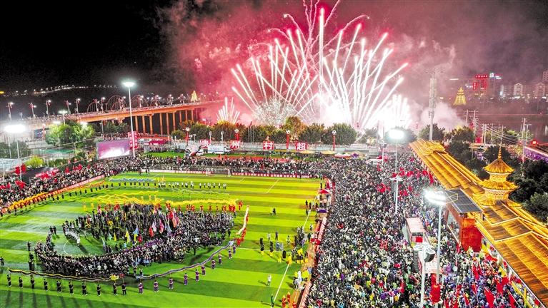 19時30分,澳門職工聯(lián)隊與貴州村超聯(lián)隊友誼賽結(jié)束后,“村超村晚”文藝展示又將整場活動推向高潮。這場晚會由民風(fēng)民俗展新顏、鄉(xiāng)村足球超快樂、貴山貴水迎貴客、龍騰盛世慶豐年4個篇章組成,參演演員近2300人。據(jù)相關(guān)負責(zé)人介紹,此次文藝展示的內(nèi)容均以榕江“村超”自創(chuàng)節(jié)目為主,同時,澳門舞醉龍表演隊在龍騰盛世慶豐收環(huán)節(jié)與貴州的舞龍隊伍共同演出,展示出兩地文化的互通互融。本次文藝展示強調(diào)“草根”和民族文化,吸引了上萬人現(xiàn)場觀看,在演出的尾聲,一場持續(xù)10余分鐘的煙花秀點亮了榕江縣的夜空,“文化味、民族味、傳承味、年味”十足的“村超村晚”在觀眾和游客的掌聲與歡呼聲中落下帷幕。