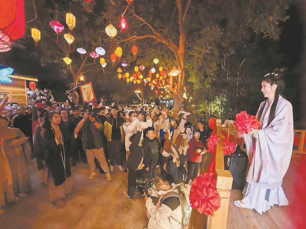 為讓游客有更好的文化體驗,今年元宵節(jié),杏陳鎮(zhèn)聯(lián)合磁窯村策劃了“浪漫元宵·緣定磁窯”沉浸式漢服游園會。當晚,身著各式漢服的演員們穿梭在各個景點,用“舞蹈+情景劇”的方式為游客獻上民族舞、古箏演奏、拋繡球等精彩表演。