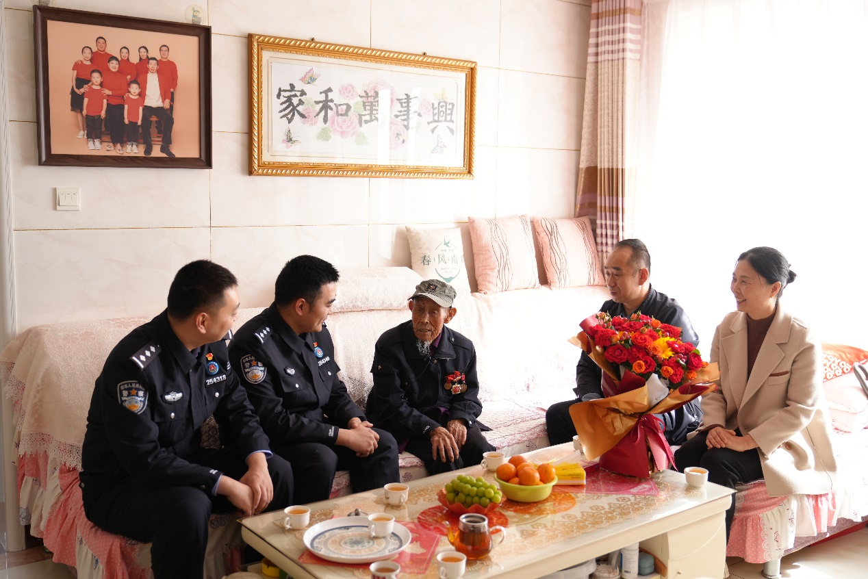 祭奠活動(dòng)結(jié)束后,民警代表來到革命前輩尹光啟家中,聽前輩講述那段轟轟烈烈的抗戰(zhàn)故事。