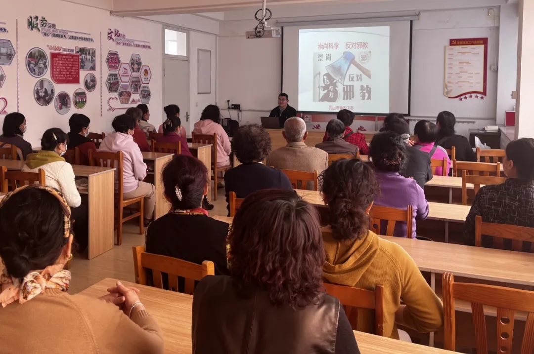 在乳山市城區(qū)街道府前社區(qū),工作人員通過知識講座、問題解答等形式向社區(qū)群眾進行宣傳,引導大家反對邪教、遠離邪教、破除迷信、崇尚科學,使社區(qū)群眾認識到邪教的危害及非法性,對邪教言論做到不聽、不信、不傳、不看,積極檢舉揭發(fā)邪教違法犯罪活動。