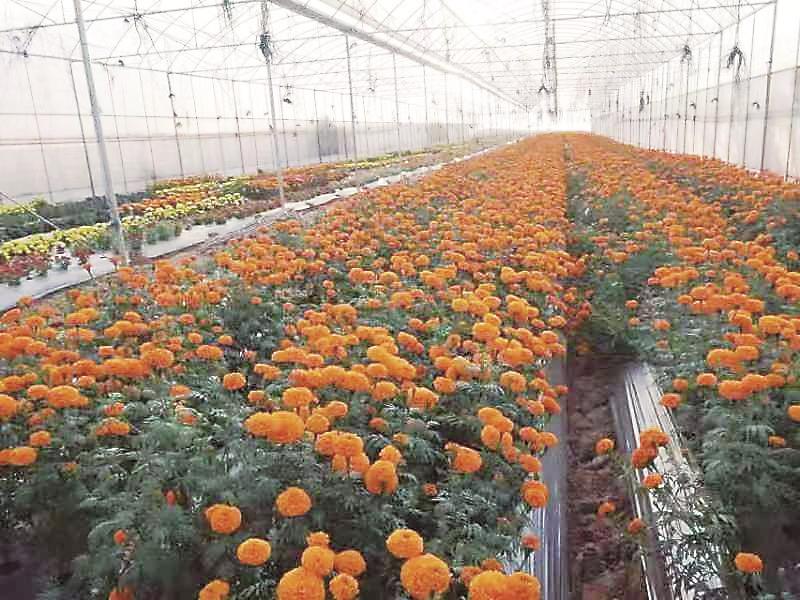 在農(nóng)安縣三盛玉鎮(zhèn)三盛玉村的花卉大棚內(nèi),滿是準(zhǔn)備移栽的萬(wàn)壽菊(資料圖片)