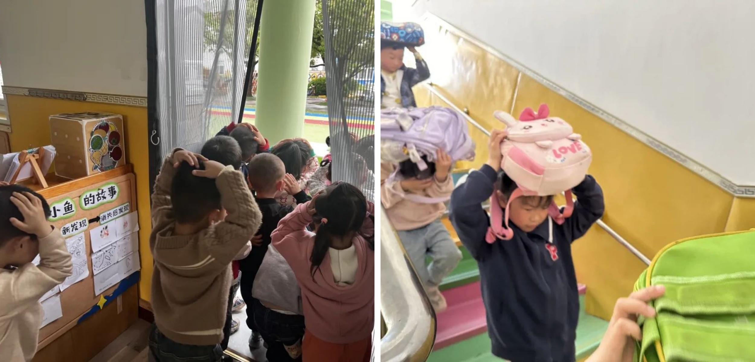 地震間隙,“警報(bào)解除”鈴聲響起,各班幼兒在老師的帶領(lǐng)下,按照指定逃生路線有序撤離至操場。孩子們聽從老師指揮,用手護(hù)住頭部,弓著腰,緊急有序地迅速撤離危險(xiǎn)地帶。孩子們撤離時(shí)不推拉、不沖撞、不擁擠。