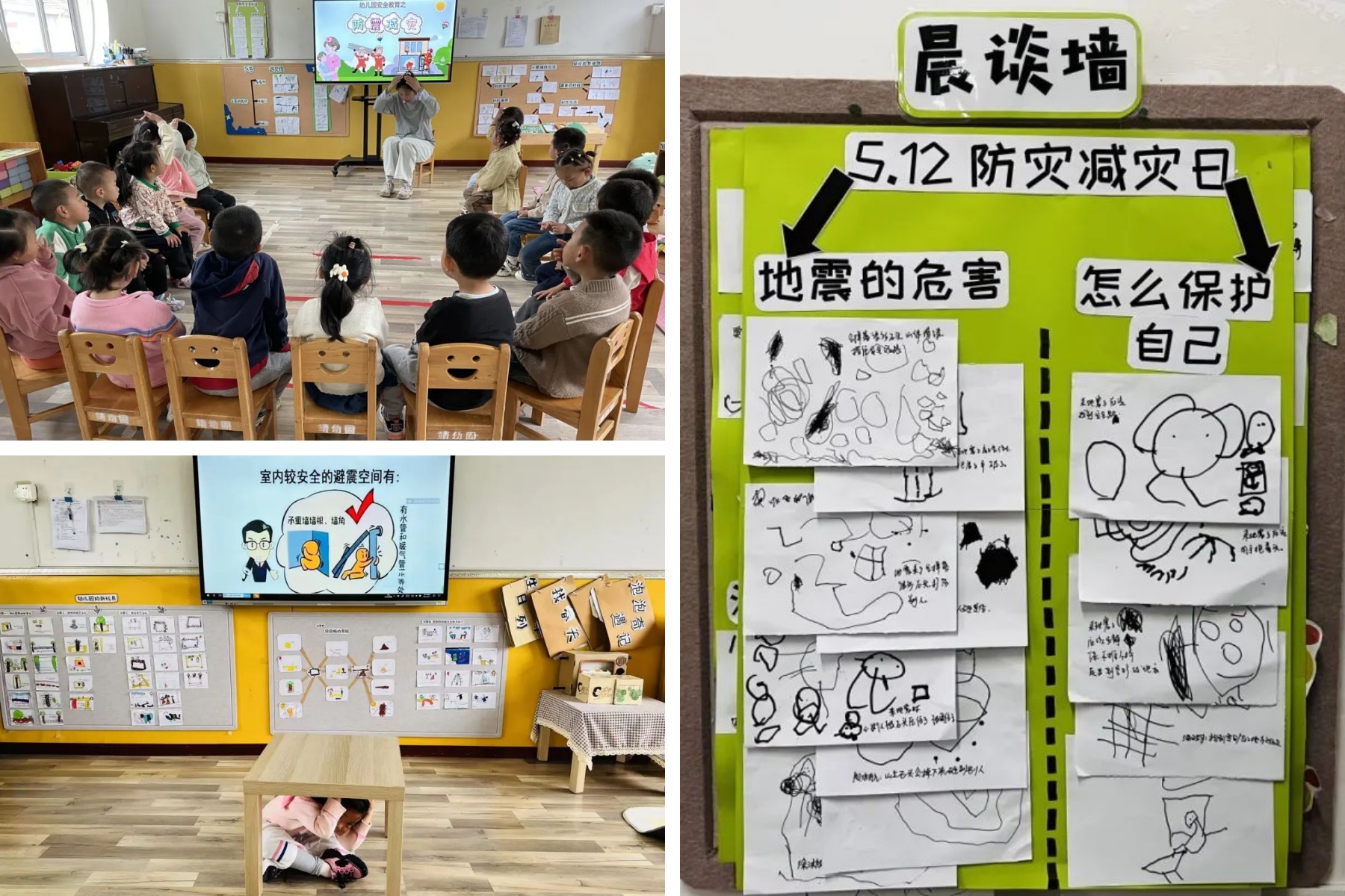 隨著警報(bào)聲響起,防震演練正式開始。各班老師聽到警報(bào),立即停止活動(dòng),有序指導(dǎo)幼兒以最快的速度躲到就近“安全三角區(qū)”,蜷縮身體,降低身體重心,保護(hù)頭部和眼睛等重要部位。
