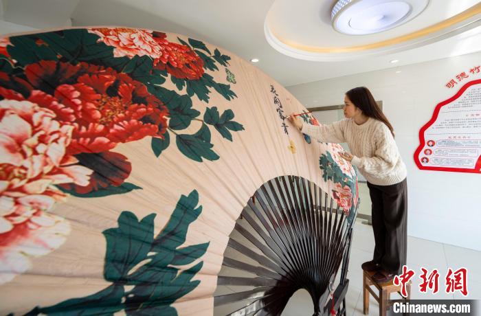 5月14日,工作人員正在專門定制的長2米,寬3.8米的大號竹扇上繪制圖案 王歌 攝