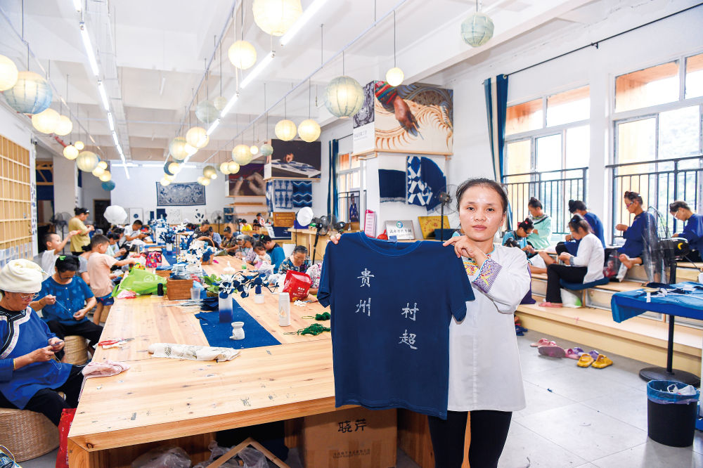 2023年5月貴州村超開賽后,現(xiàn)場(chǎng)數(shù)萬群眾踴躍參與的熱情、場(chǎng)內(nèi)外豐富瑰麗的非遺展演,讓這項(xiàng)村級(jí)賽事迅速在全網(wǎng)發(fā)酵。村超爆紅,讓貴州多彩民族文化“被看見”,更帶動(dòng)了當(dāng)?shù)靥厣椀仁止に嚻贰俺鋈Α?,榕江村寨里以往賦閑在家、照看孫輩的嬢嬢們,因此有了在家門口、江水邊、榕樹下發(fā)揮特長(zhǎng)就業(yè)創(chuàng)收的機(jī)會(huì)。