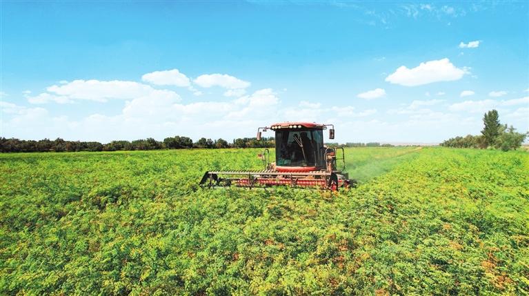 飲馬農(nóng)場的田野上,一片片綠瑩瑩的紫花苜蓿隨風(fēng)搖曳。農(nóng)場今年種植的2.53萬畝苜蓿生長旺盛,主要有加拿大阿蒂娜、美國WJ363HK、金皇后、法園良種2號和國產(chǎn)耐鹽紫星等優(yōu)良品種。