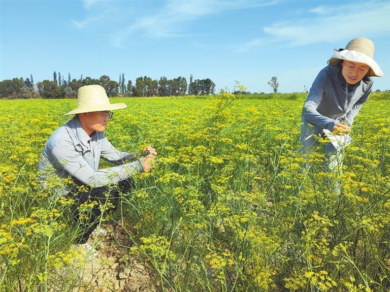 “種茴香省工省力,耗水少,市場價(jià)格相對穩(wěn)定,在每斤5元以上,效益比較可觀。今年我們種植了鐵桿茴香,通過施入生物菌肥‘保根120’,茴香表現(xiàn)出了優(yōu)異的抗重茬、防根腐等效果,預(yù)計(jì)產(chǎn)量不錯(cuò)?!秉S花農(nóng)場產(chǎn)業(yè)發(fā)展部副部長張?jiān)露鸾榻B,她一邊觀察茴香長勢,一邊測定土壤墑情。