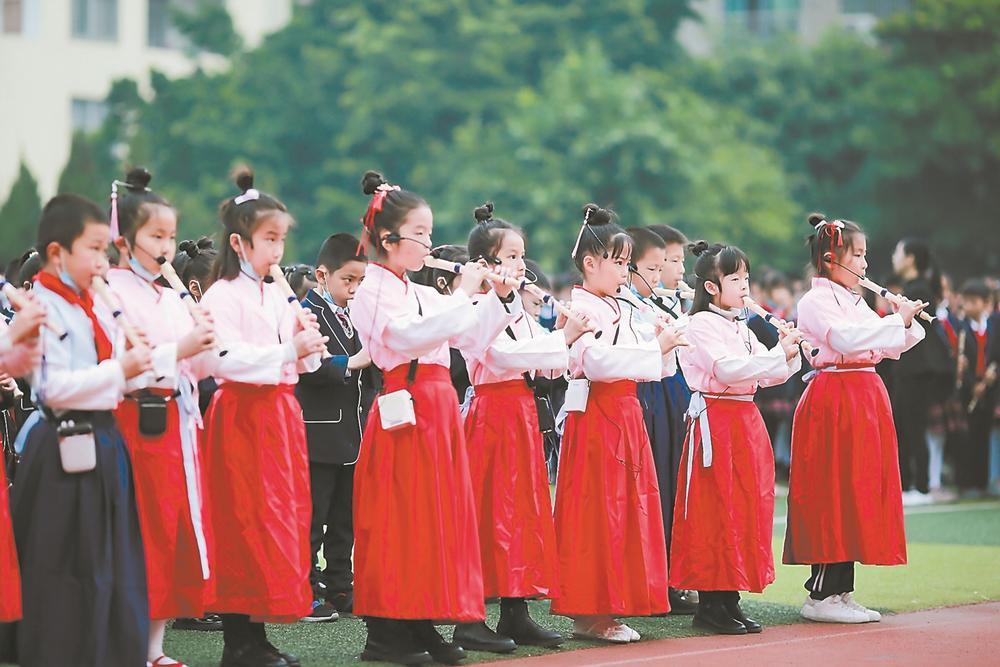 “伡鼓隊籌備4個月了,目前教師隊伍已由鄉(xiāng)土音樂專家培訓(xùn)并出師,基礎(chǔ)教材也編寫完畢,下學(xué)期就可以呈現(xiàn)在音樂課堂上?!逼翁锏谑袑W(xué)音樂組教師郭劍光說。