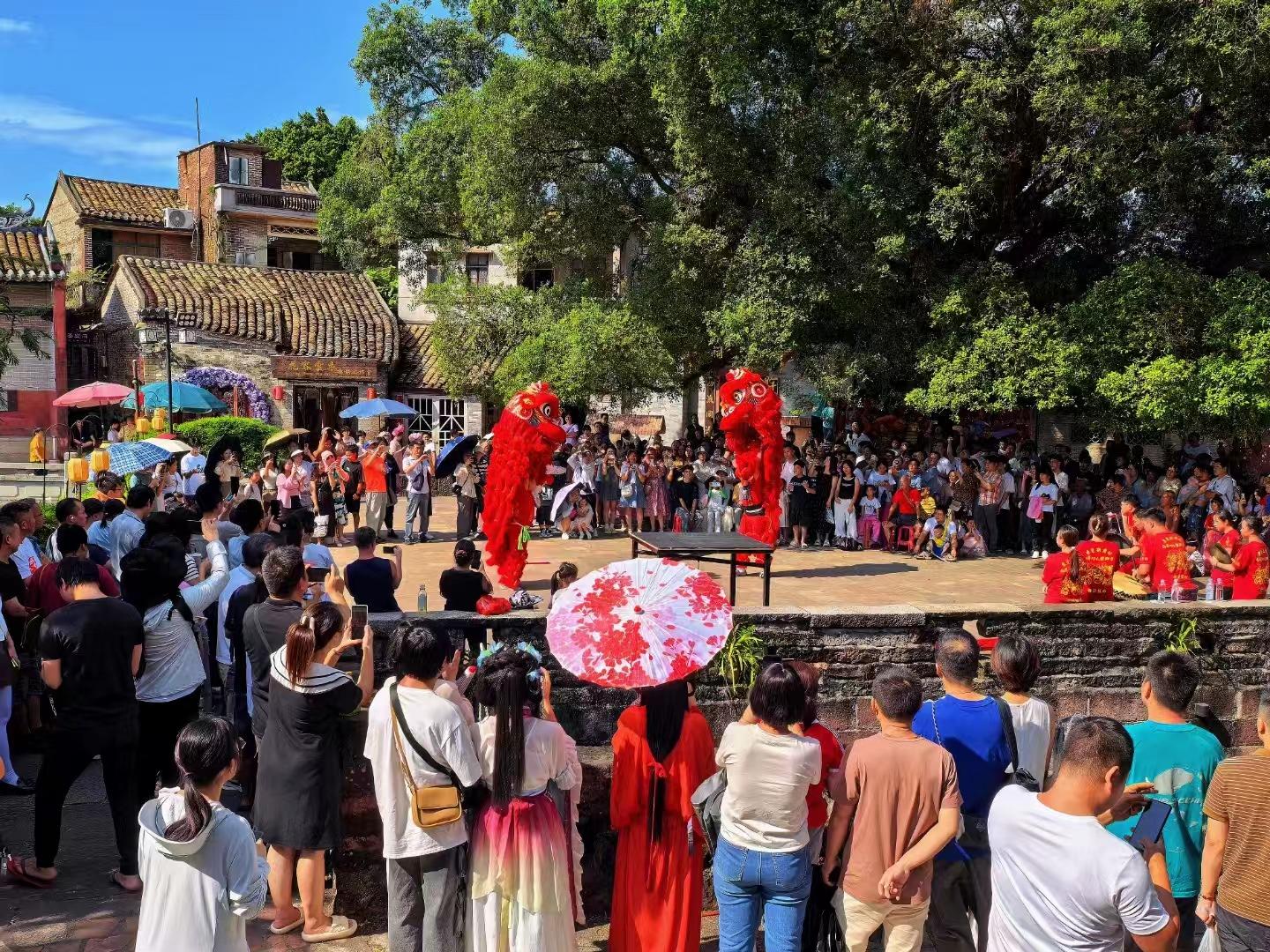 國慶假期,不少游客走進(jìn)廣東省東莞市茶山鎮(zhèn)南社明清古村落,在舞獅、粵劇、太極表演、農(nóng)耕巡游、婚嫁巡游等具有嶺南特色的民俗活動(dòng)中,感受800年南社的悠悠古韻。南社創(chuàng)意公司運(yùn)營總監(jiān)陳玲介紹,國慶期間,南社村的客流量比平日有明顯提升?!斑@里風(fēng)景優(yōu)美,傳統(tǒng)文化氛圍濃厚,是短途旅行的好選擇?!庇慰腿~先生表示。