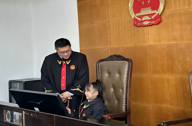 小朋友們在工作人員的帶領(lǐng)下步入審判庭,他們穿上法袍,坐上審判席,敲響法槌,深度體驗“小法官”的角色。在工作人員的演示與指導(dǎo)下,孩子們進一步知曉了法庭工作人員的職責(zé)。