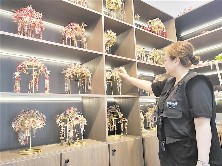在主街福寧街上,劉莎的影樓內外裝修格外別致,櫥窗設計明亮而時尚。21年前,劉莎從新疆來到閩寧鎮(zhèn)創(chuàng)業(yè)開辦了一個百平方米的影樓,她也親眼見證了閩寧鎮(zhèn)各族移民從“吃飽穿暖”到“要生活品質”的嬗變?!斑^去我走村串戶給新娘化妝,能接一單五六百元錢的生意就是大單,現(xiàn)在人們生活越來越好,都來店里化妝,可以選擇做中式或西式等多種造型,接到3000多元的生意很平常。”近些年,消費業(yè)態(tài)不斷向新,激勵劉莎的影樓也不斷轉型升級,她不僅將影樓面積擴大至500平方米,招聘了4名固定店員,推出了數(shù)十種的攝影服務,還提供銀川周邊的旅拍。“銀川有的,我們這里也有,最近我打算外出再購置一些新的拍攝服裝,群眾消費在升級,我的服務也要升級,要跟得上群眾的需求?。 眲⑸呛堑卣f。