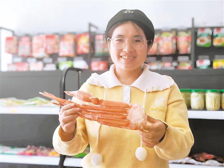 喜存英向記者展示在店鋪開張當日非常走俏的產品蟹腿
