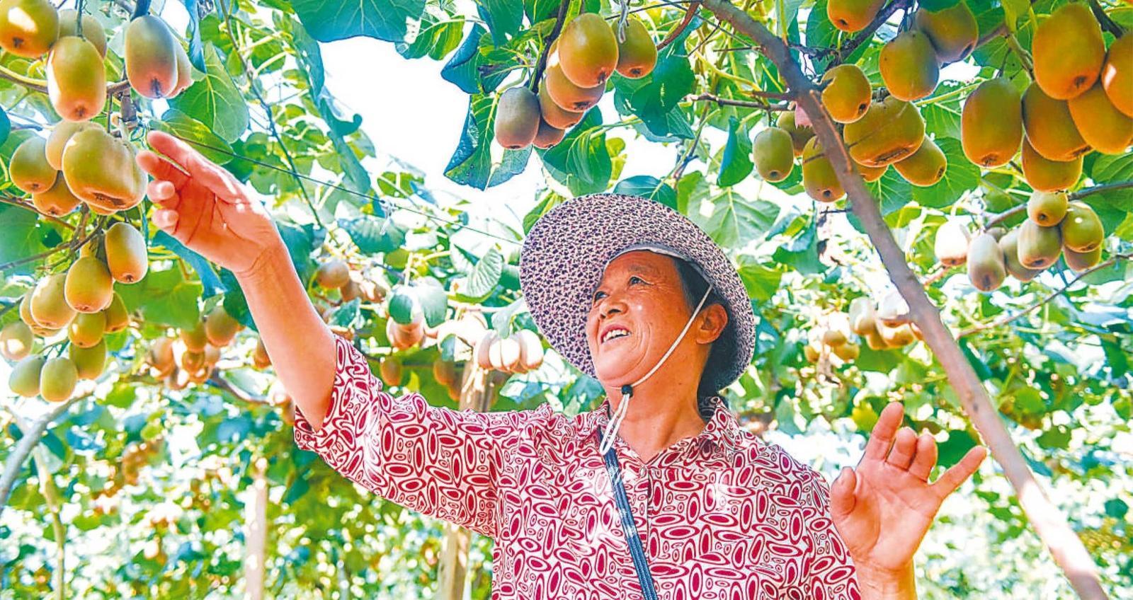 在明光市自來橋鎮(zhèn)的獼猴桃采摘園,農(nóng)戶在查看獼猴桃長勢 王緒波 尹思源 攝