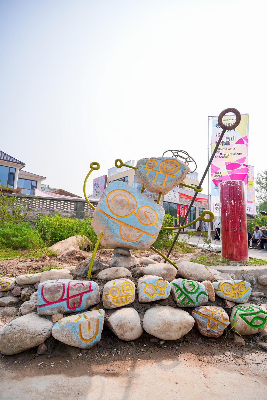 如今,南山村村口灰撲撲的石頭圍墻變成了一面豐收墻,大家把石頭涂畫成白菜、柿子、大桃等果蔬的樣子;清華美院在胡同安裝了交互感應裝置,夜晚有人走過,就會投射出一只奔跑的夜光兔子;北京林業(yè)大學用玻璃飲料瓶復現(xiàn)了村里曾經出土的文物石馬,名為《馬放南山》……環(huán)境變好了,加上南山藝術季的帶動效應,村民的柿子、山里紅、核桃也都賣出去了,鄉(xiāng)村建設還讓村里的石匠、瓦工有了在家門口掙錢的機會。