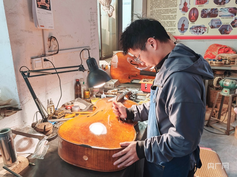 確山縣手工提琴制作協(xié)會(huì)會(huì)長(zhǎng)王金堂見(jiàn)證了家鄉(xiāng)提琴產(chǎn)業(yè)從無(wú)到有、從弱到強(qiáng)的全過(guò)程。2015年,他率先返鄉(xiāng)創(chuàng)立河南省金鳴樂(lè)器股份有限公司,并帶領(lǐng)一批制琴師回到確山創(chuàng)業(yè)。他們通過(guò)改進(jìn)工藝、研發(fā)新品,將確山提琴打造成國(guó)際高端市場(chǎng)的寵兒。王金堂介紹,他的一把定制手工提琴曾以20萬(wàn)美元的價(jià)格賣出。