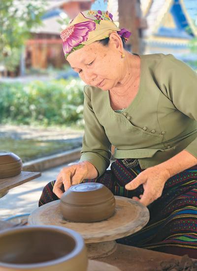 在景萊村的一處木亭里,63歲的玉相論正垂目凝神、轉(zhuǎn)動(dòng)拉坯轉(zhuǎn)輪,一個(gè)普通的陶坯在她手下逐漸變身為帶有壺嘴的陶罐。玉相論43歲才開始學(xué)習(xí)傣族慢輪制陶技藝,現(xiàn)在她是西雙版納州級(jí)非遺傳承人。“把制陶的方法傳下去,也是把傣家人的生活方式傳下去?!庇裣嗾撜f。